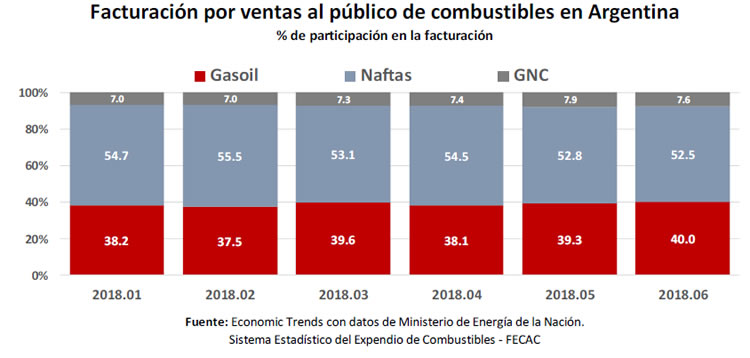 Según precisa el documento, al 30 de julio de 2018, el precio de las naftas en Argentina estuvo por debajo de la mayoría de los países de la región, USD 1.06 por litro. Fue superado por Paraguay (USD 1.08 por litro), Perú (USD 1.09 por litro), Brasil (USD 1.20 por litro), Chile (USD 1.33 por litro) y Uruguay (USD 1.80 por litro). Lo mismo ocurrió con el gasoil.