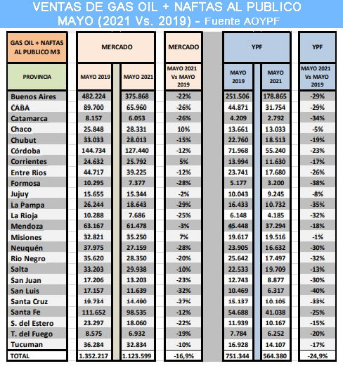 La conclusión se desprende de la comparación de la demanda en mayo 2019 versus el mismo mes de 2021. El relevamiento fue efectuado por la Asociación Operadores de YPF en base a datos oficiales de la Secretaría de Energía.