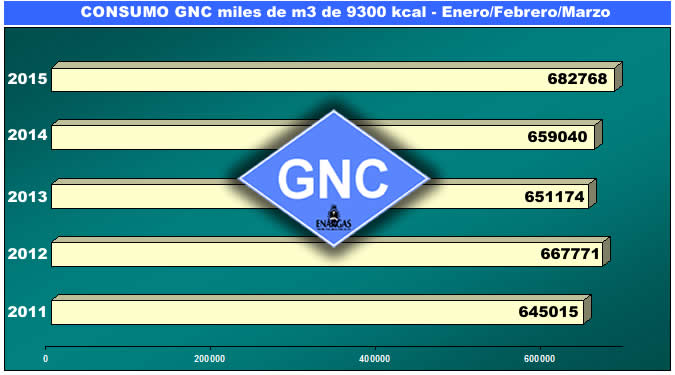 De enero a marzo, la demanda de GNC alcanzó los 682.768 miles de m3 de 9300 kcal, mientras que en 2014 el volumen fue de 659.040. No obstante este crecimiento, la participación del combustible automotor ocupa tan solo el 10.6 por ciento de la canasta gasífera, en tanto que el sector industrial acapara el 34.4, las centrales hidroeléctricas el 30.6 y el consumo residencial el 17.2 por ciento.