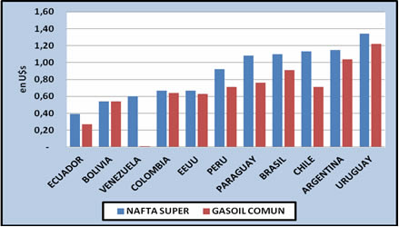 Estos incrementos en el surtidor hicieron que Argentina se ubique “entre los países que tiene la nafta súper más cara de la región alcanzando los 1,15 dólares por litro, junto a Uruguay y Chile, importadores de petróleo”, indica un informe elaborado por la Confederación de Empresarios de Combustibles y Afines de la República Argentina (CECHA).