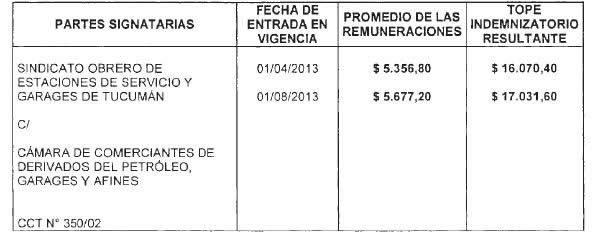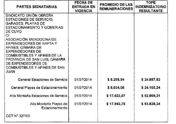A través de la Resolución que lleva por número 199/2014 el Ministerio de Trabajo determinó el importe promedio de las remuneraciones y el tope indemnizatorio correspondiente al acuerdo salarial entre el Sindicato Unión Obrera Estaciones de Servicio de Cuyo y la Cámara de Expendedores de esa provincia, en el marco del Convenio Colectivo de Trabajo Nº 327/00, conforme lo dispuesto en la Ley de Negociación Colectiva Nº 14.250.