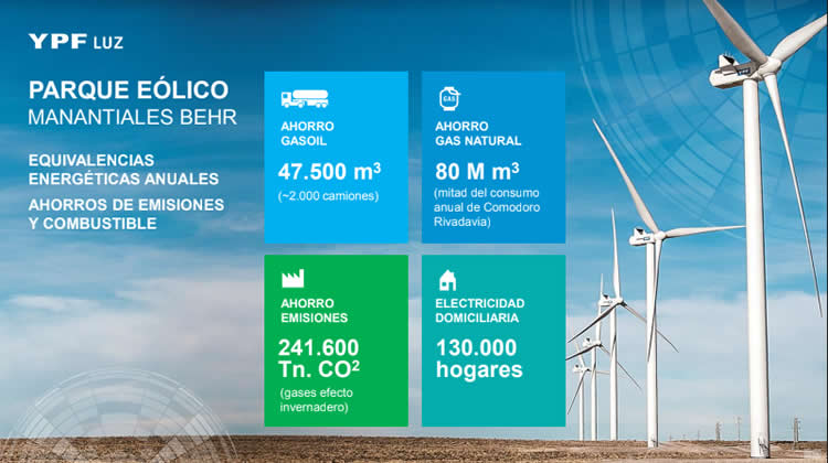Además, Manantiales Behr, por su ubicación privilegiada, aprovecha los vientos de la Patagonia, que en esa zona disponen de uno de los factores más altos del mundo en términos de capacidad de potencia instalada, que ronda un 59 por ciento.