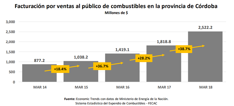 Por último, dedujo que la facturación total de las Estaciones de Servicio de Córdoba, por venta al público de combustibles líquidos (gasoil y naftas) y GNC, durante marzo de 2018, fue de $2,522.2 millones (sin impuestos), estuvieron un 38.7 por encima del monto facturado en marzo de 2017 y 14 arriba de la inflación registrada en la provincia durante el periodo.