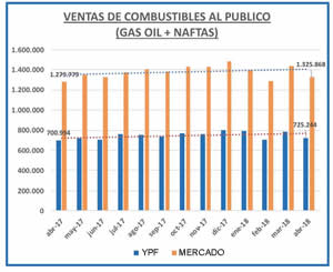 Respecto al gasoil, las bocas YPF comercializaron 1.274.706 m3 de gasoil, un 0,2 por ciento más, llegando al 52 por ciento del mercado en este tipo de combustibles en el rango enero-abril 2018.