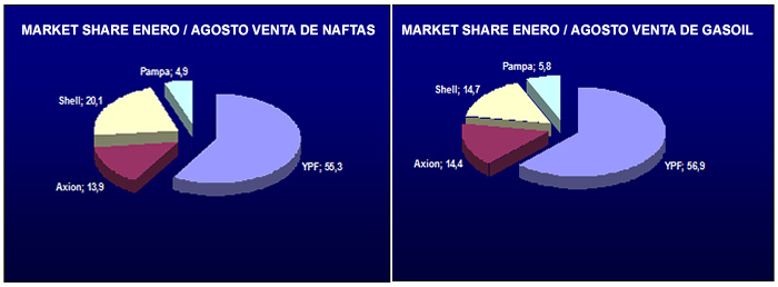 Este volumen se distribuye casi en su totalidad entre nueve compañías, de las cuales tan solo tres acaparan el 87.4 por ciento del mercado: YPF (56.3 por ciento), Shell (16.9) y AXION energy (14.2).