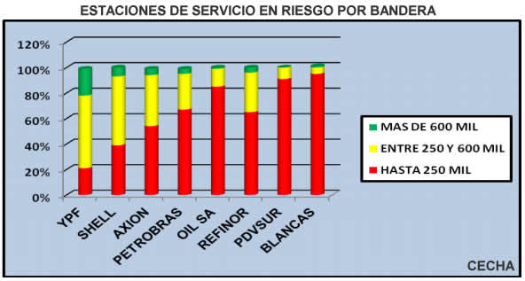 En base a estos antecedentes, CECHA realizó un relevamiento de las marcas más potencialmente comprometidas por volúmenes de venta. Salvo, YPF y Shell, las restantes compañías superan la media en la cantidad de expendedoras que venden hasta 250 mil litros. Las que exceden este porcentaje son Oil Combustibles y Pdvsur, siendo sus estaciones las más complicadas, junto a las blancas, que superan el 90 por ciento y tienen las mayores probabilidades de cierre.