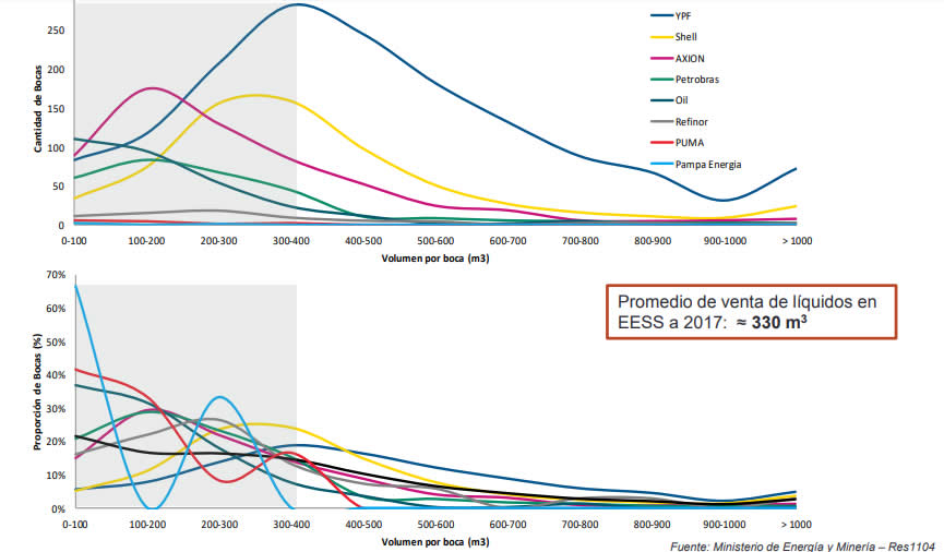 De acuerdo al relevamiento, YPF es la empresa que cuenta con mayor cantidad de expendedoras que se ubican en ese segmento. Shell es la que le sigue y Axion cierra el podio. La estatal cuenta también con más de 200 establecimientos que distribuyen entre 400 y 500 m3 y más de 150 que llegan a 600.