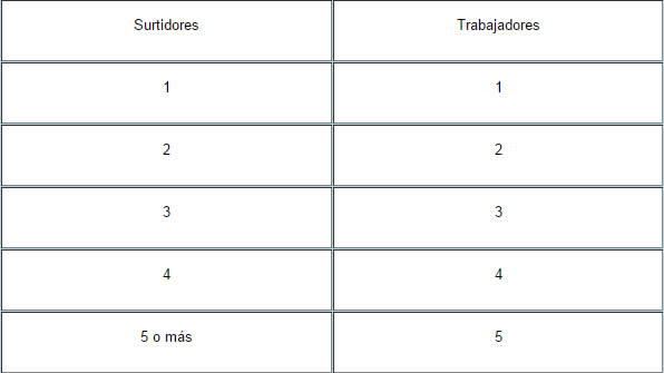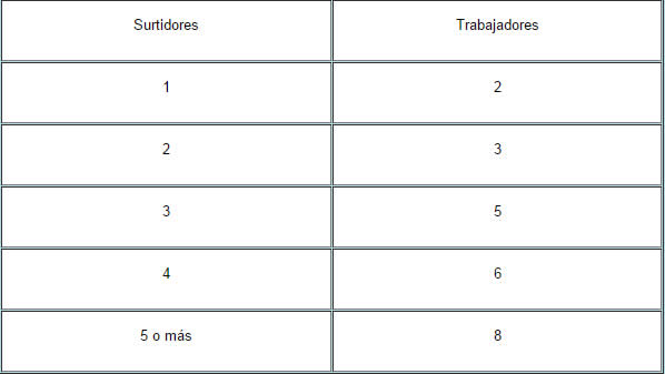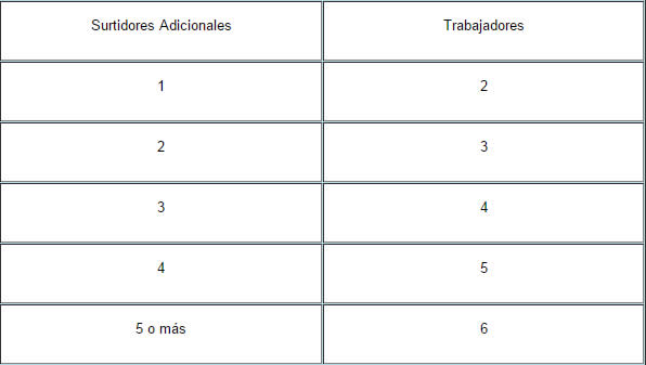 Por cada surtidor doble adicional al considerado dentro del mínimo se deberá agregar la cantidad de trabajadores establecida en la siguiente escala: