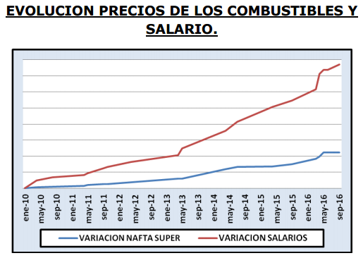 Según un estudio dado a conocer por la Confederación de Entidades del Comercio de los Hidrocarburos (CECHA), desde 2010 a la fecha los salarios han tenido un incremento de 1098 por ciento y la suba de la nafta súper ha sido de 446 y de 473 en el gasoil G2.