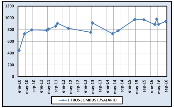Respecto a la proporción entre los litros que se requerían para cubrir los costos salariales de un operario de playa, desde 2010 a la fecha considerando una estación que vende 60 por ciento de gasoil y 40 de nafta Súper; en 2010 hacían falta 442 litros y en septiembre de 2016, 942 litros.