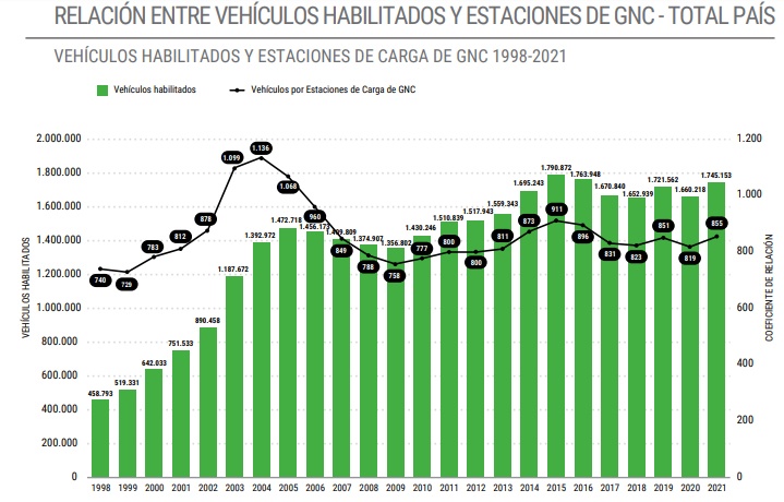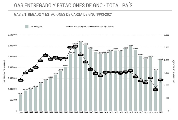 En el gráfico puede observarse la evolución del gas entregado por estaciones de carga en todo el territorio nacional. En este progreso puede destacarse que en 2021 se registró un considerable aumento de la cantidad -medida en miles de metros cúbicos (m3) de 9.300 kilocalorías- de Gas Natural Comprimido respecto al año anterior.