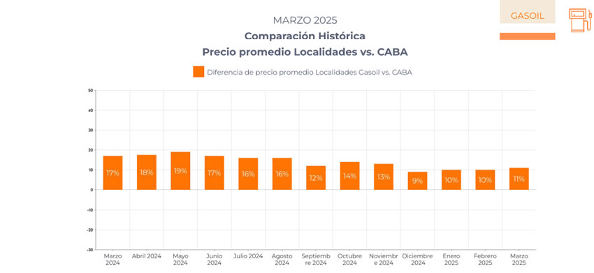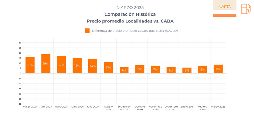 En la comparación interanual, es decir, entre marzo de 2024 y marzo de 2025, se observa que la nafta aumentó un 37,2 por ciento en el interior y un 46,6 por ciento en CABA, mostrando un ritmo más acelerado de subas en la capital durante ese período. Sin embargo, el comportamiento de los últimos meses comienza a revertir esta lógica.