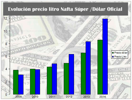 Debido a los cambios que se produjeron en el sector energético la relación entre un litro de nafta súper y la cotización del dólar oficial, cambió sustancialmente. Cuando en 2009, se compraba esta cantidad de combustible con el 80 por ciento de lo que valía un dólar, en la actualidad, es necesario 1.40, para cargar en una boca de expendio de YPF de la Capital Federal, que es la referencia más accesible al bolsillo.