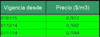 Sin embargo el organismo difundió en su portal la variación del gas por redes para GNC que fija desde el mes de enero un precio de costo de $ 0.7612 por metro cúbico, $0.01 por encima del mes de diciembre de 2014.