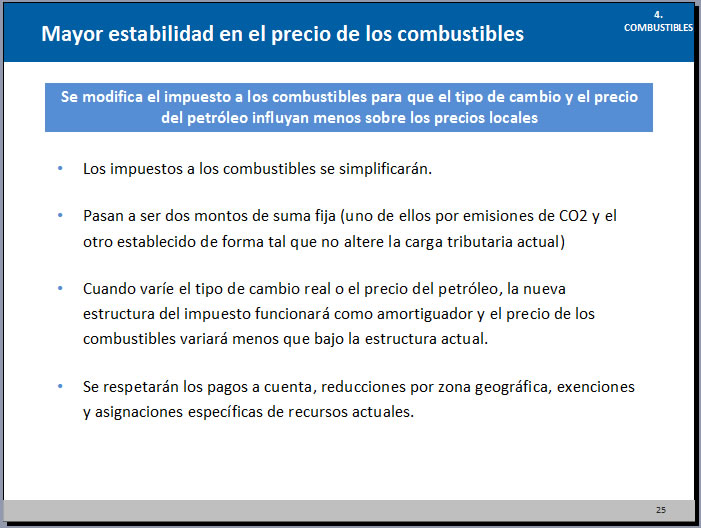 La iniciativa tiene un apartado especial para el impuesto a los combustibles que hoy grava más del 45 por ciento de su valor en el surtidor. Al respecto, el funcionario afirmó que “con la reforma reforzamos nuestro compromiso con el cuidado del medioambiente. Proponemos la modificación del impuesto a los combustibles para que este dependa de la cantidad de dióxido de carbono emitido. El impuesto afectará al principio a los líquidos y de 2020 en adelante se aplicará también sobre gas natural, GLP y carbón”.