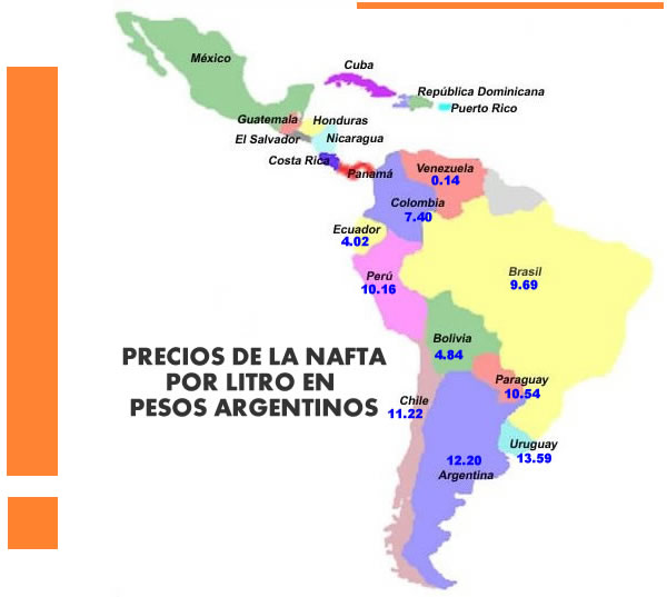 El precio medio del litro de nafta súper en todo el mundo es de 10.24 pesos argentinos según estima el portal Globalprices.com. De acuerdo a esta estimación, tras el último aumento, el valor en los surtidores de nuestro país se ubica 20 por ciento (y hasta 40 en el interior) por encima de esa marca cuando un año antes se encontraba incluida en ese parámetro.