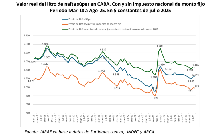 La foto actual refleja un equilibrio inestable. El litro de nafta en CABA cuesta $1.244 en valores constantes de julio de 2025, de los cuales $262 corresponden al impuesto y $982 al precio neto. Para dimensionar el impacto del tributo, basta con un ejercicio contrafáctico: si el impuesto hubiese mantenido el mismo poder de compra que tenía en marzo de 2018, la nafta hoy valdría $1.466, es decir, un 18 por ciento más cara.
