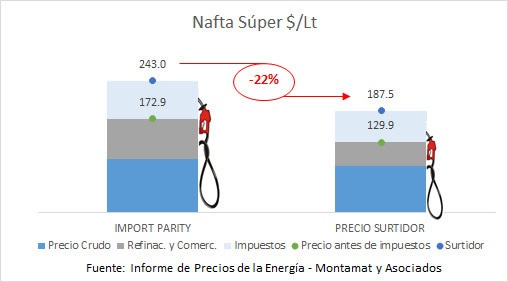 En el primero de los casos, el desfase escaló del 17 al 22 por ciento debido a que el litro en Gran Buenos Aires ronda los $187,50, pero el import parity (IP) se calcula en $243. En tanto que para el diésel común, la relación es de $212,20 (CABA) versus $258 (paridad de importación), lo que significa que la brecha disminuyó 4 puntos y se ubica en 18 por ciento.