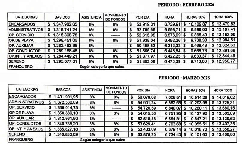 La actualización salarial impacta sobre todas las categorías del convenio colectivo que rige la actividad, desde encargados y administrativos hasta operadores de playa, conductores y personal de servicios anexos. Con la nueva escala correspondiente a marzo de 2026, el salario básico de un encargado supera los 1,4 millones de pesos mensuales, mientras que el de un operador de playa —una de las categorías más representativas del sector— se ubica por encima de los 1,35 millones de pesos.