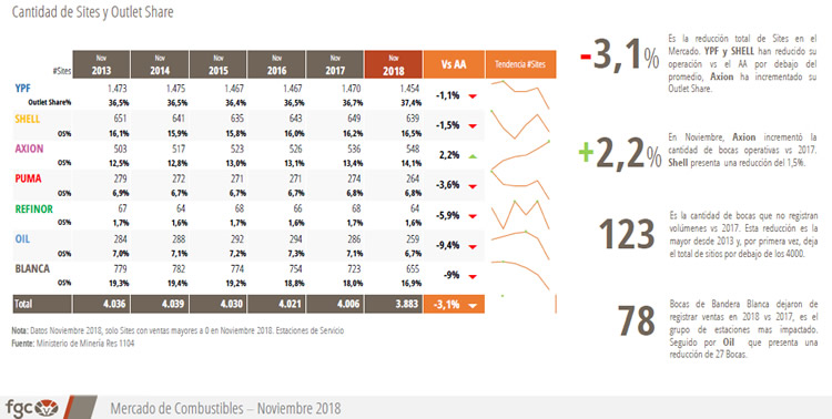 La consultora FGC elaboró un informe especial respecto al comportamiento de cada petrolera en el mercado. Precisa que en 2018 cerró una Estación de Servicio de líquidos cada tres días
