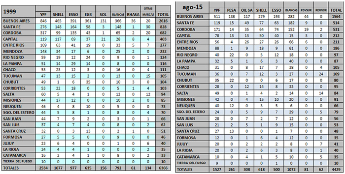 A continuación se detallan las Estaciones de Servicio por provincias y por marca para los períodos 1999 y 2015.