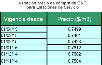 Tal como establece la Resolución 231/2014, la Comisión de Planificación y Coordinación Estratégica del Plan Nacional de Inversiones Hidrocarburíferas dio a conocer el nuevo costo del precio del gas natural en el punto de ingreso al sistema de transporte destinado al suministro de gas natural comprimido (GNC) en estaciones de servicio.