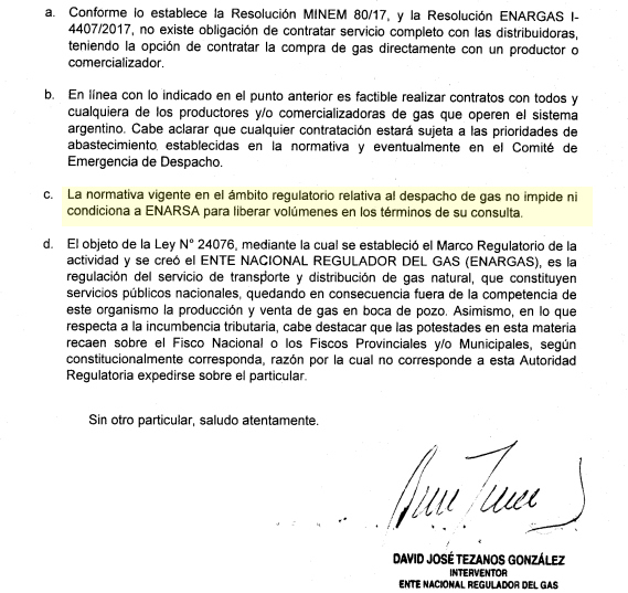 Esta situación motivó el reclamo de los estacioneros al ENARGAS para que interceda en defensa de las expendedoras. Tras más de 10 días de espera, su interventor, David Tezanos, respondió mediante una nota que “ENARSA no esta ni impedida ni condicionada para liberar volumen a las GNC”. Es decir que la decisión de la energética nacional de no suministrar el gas a la GNC es totalmente libre y la lógica indica que esta empresa que adquiere el gas importado o regasificado a un mayor valor no lo comercializará a uno inferior enviándolo al segmento de las Estaciones.