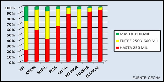 El análisis de los expertos de la Confederación de Entidades del Comercio de Hidrocarburos y Afines de la República Argentina (CECHA) determinó que considerando el volumen de entrega de combustibles líquidos “el 51 por ciento de las estaciones de servicio despacha hasta 250 mil litros, el 37 por ciento entre 250 y 600, y solo el 12 más de 600 mil litros”.