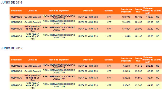 Vázquez puso un ejemplo, de la única estación de servicio de la ciudad de Médanos, en la Provincia de Buenos Aires, y de acuerdo con la información recabada de acuerdo con la Resolución 1104 de la Secretaría de Energía, comparando volúmenes vendidos en el mes de junio de 2015 y de 2016.