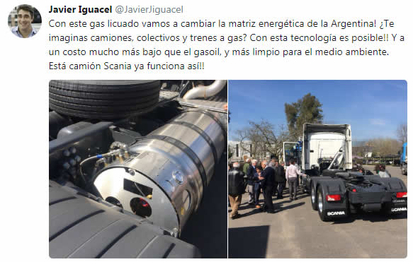 “¡Con este gas licuado vamos a cambiar la matriz energética de la Argentina! ¿Te imaginas camiones, colectivos y trenes a gas? Con esta tecnología es posible!! Y a un costo mucho más bajo que el gasoil, y más limpio para el medio ambiente”, publicó en su cuenta de la red social Twitter.