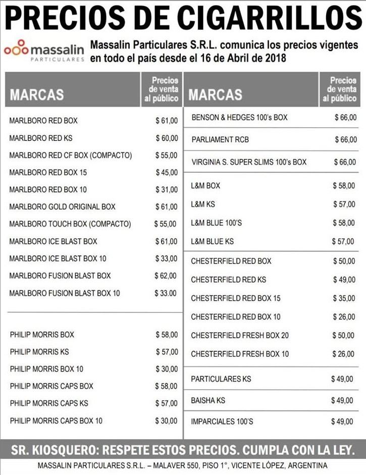 Según la comunicación, el paquete de Marlboro Red Box costará $ 61; el KS, $ 60; el Red Box de 15, $ 45 y el de 10, $ 31. En tanto, el Philips Morris Box de 20 pasará a costar $ 58; el KS, $ 57; y el de 10 unidades, $ 30.