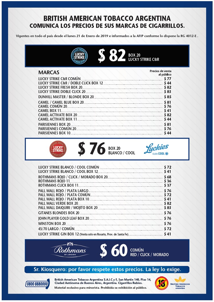 De esta forma, las variedades de Lucky Strike Box 20 tendrá un valor de $82, Doble Click 20 saldrá $83, y C&R KS 20, $77. Camel Box 20 por ejemplo, tendrá un precio de 81 pesos, al igual que que la misma versión de Parisiennes Box 20.