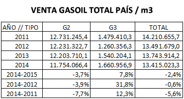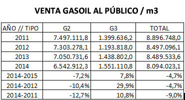 “Tomando años completos el gasoil grado 2 (G2) cayó entre el 2014 y el 2011 un 7,7 por ciento mientras que grado 3 (G3) de menor contenido de azufre, incrementó su venta en un 12,3, arrojando un resultado global declinante del 5,6 por ciento”, revela.
