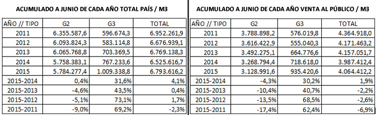 Si queremos incorporar al análisis la evolución durante el 2015, se pueden comparar las ventas durante el primer semestre de cada año (último dato informado por la Secretaría de Energía para el 2015):
