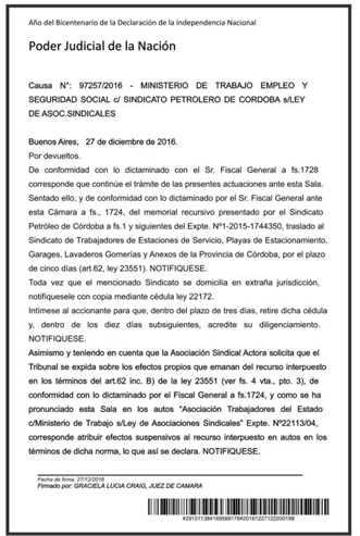Tras la disputa originada en la provincia de Córdoba por la representatividad del personal que se desempeña en estaciones de servicio, el Poder Judicial de la Nación dictó el efecto suspensivo de la medida dispuesta por el Ministerio de Trabajo de otorgar la personería gremial a otro sindicato.