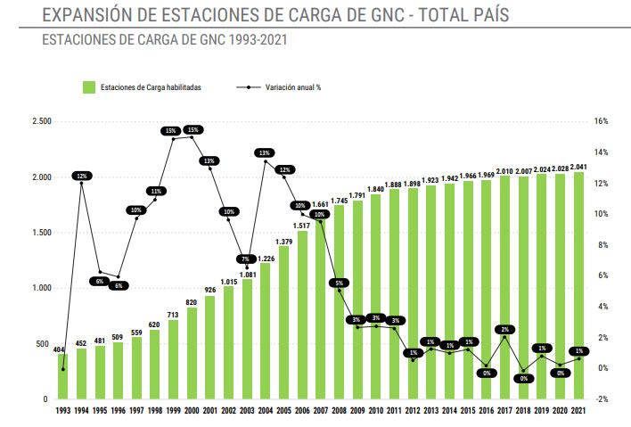 ENARGAS difundió un relevamiento sobre la evolución de la cantidad de estaciones de carga habilitadas de Gas Natural Comprimido en todo el país durante el período 1993-2021.