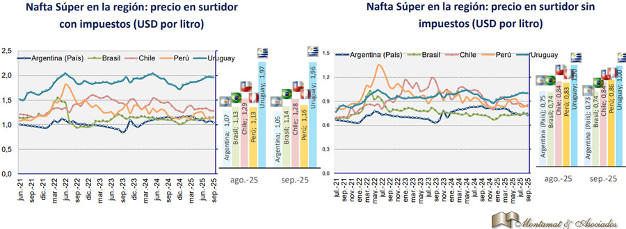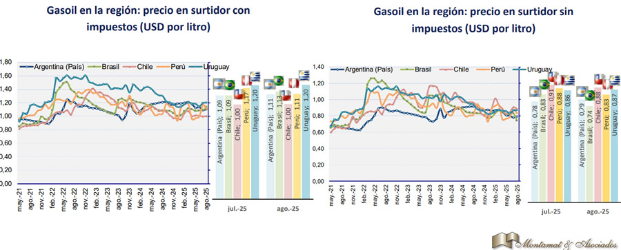 La comparación se vuelve aún más llamativa cuando se consideran los precios netos de impuestos. Bajo ese parámetro, el gasoil argentino resulta más caro que el de Brasil, aunque sigue siendo más barato que el del resto de los países latinoamericanos. Este matiz revela la importancia de la carga impositiva en la formación del precio final y el peso que tiene la estructura tributaria en la competitividad regional.