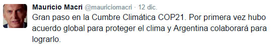 “Gran paso en la Cumbre Climática COP21. Por primera vez hubo acuerdo global para proteger el clima y Argentina colaborará para lograrlo“, mencionó el Presidente desde su cuenta de la red social Twitter.