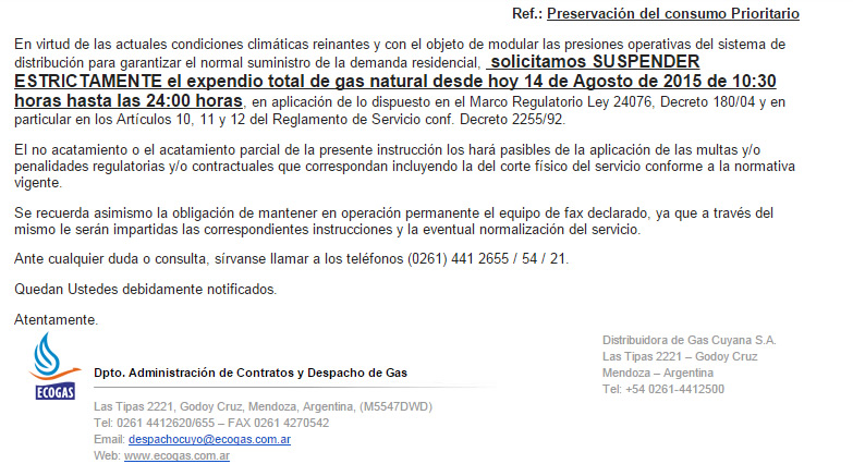 Como agravante, Ecogas Cuyo no avisa con anticipación las medidas, lo que dificulta la planificación de los comercios: “Al no saber en qué horario va a estar disponible el servicio es difícil organizar la necesidad de personal; de todas maneras está el compromiso del sector empresario de pagar los sueldos”.