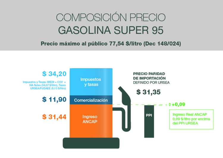 Para el caso de este combustible, el peso de los impuestos y las tasas representan $ 34.20 de su precio de venta al público, mientras que ANCAP percibe por cada litro $ 31.44, con una ganancia de apenas 0.09 centésimos si consideramos que el PPI es de $ 31.35.