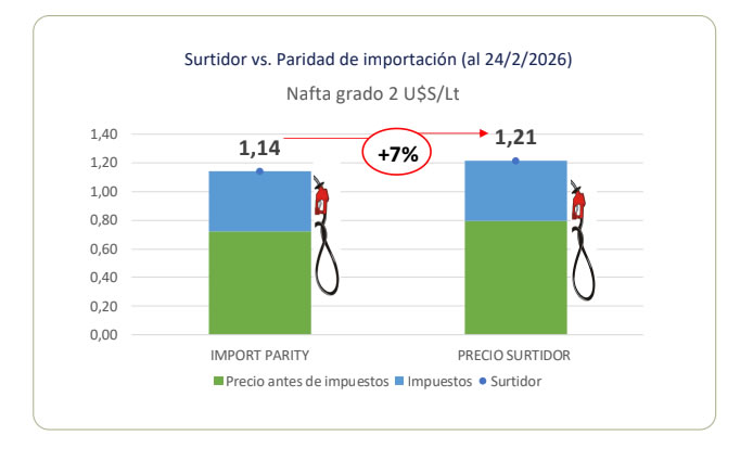 Para las Estaciones de Servicio, el dato central es la relación entre el precio en surtidor y la denominada paridad de importación. Este concepto técnico estima cuánto debería costar el combustible si fuera traído del exterior, sumando precio internacional, flete, carga impositiva y costos internos. De acuerdo con el informe, la nafta súper promedia los 1.719 pesos por litro y se ubica alrededor de un 7 por ciento por encima de esa referencia. El gasoil grado 2 ronda los 1.810 pesos y quedó prácticamente alineado. En el segmento premium, la diferencia es más marcada: las naftas superan la paridad en torno al 18 por ciento y el gasoil de mayor calidad cerca del 6 por ciento.