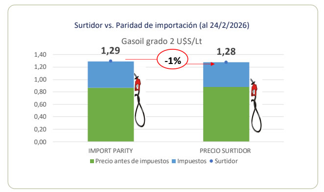 Un informe de la consultora de Daniel Montamat señala que, tras los aumentos de febrero, la nafta y el gasoil se ubican en línea o por encima de la paridad de importación. No obstante, la tensión geopolítica y presión alcista sobre el Brent podría modificar la situación.