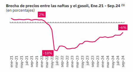 El informe señala también una tendencia decreciente en la brecha de precios entre los tipos de combustibles disponibles. Aunque la diferencia entre las naftas y el gasoil ha disminuido en los últimos meses, este último continúa siendo más caro que las naftas, lo que rompe con una tendencia histórica en el país.