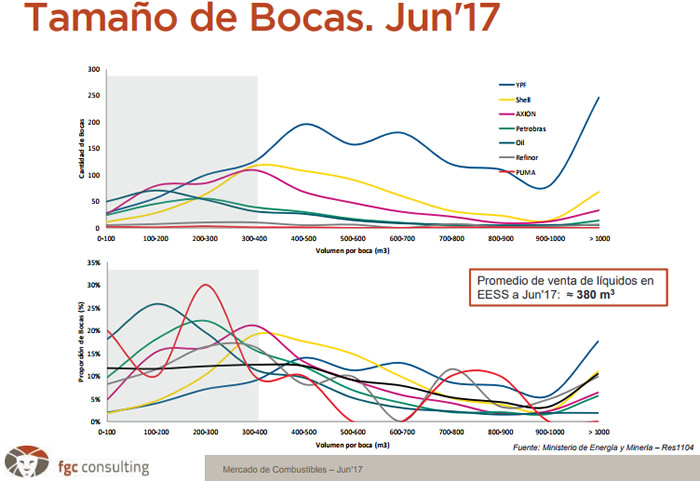 Estas dos últimas empresas cuentan con un buen número de Estaciones que venden entre 300 y 400 mil litros; Petrobrás, entre 200 y 300 y Oil Combustibles, entre 100 y 200 mil litros.