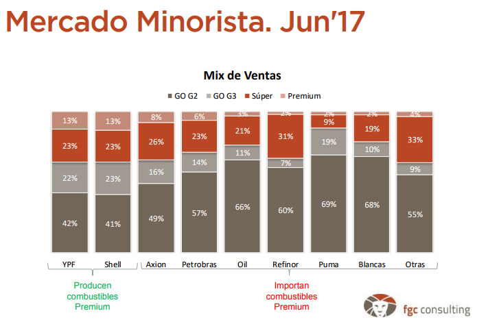 Según precisa un completo informe sobre la actividad del sector minorista desarrollado por la consultora especializada FGC Consulting en base a datos del Ministerio de Energía, las compañías que producen combustibles de alta calidad son las que ofrecen mayor diversidad, en tanto que el resto –deben importarlo- tienen fuerte incidencia en los de menores atributos.