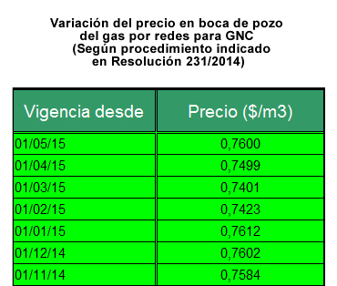 Tal como establece la Resolución 231/2014, la Comisión de Planificación y Coordinación Estratégica del Plan Nacional de Inversiones Hidrocarburíferas dio a conocer el nuevo costo del precio del gas natural en el punto de ingreso al sistema de transporte destinado al suministro de gas natural comprimido (GNC) en estaciones de servicio.