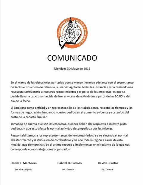“Responsabilizamos a los representantes del empresariado si se ve afectado el normal abastecimiento y distribución de combustible y gas de toda la región a causa de esta medida, que siempre ha sido el último recurso a implementar en el reclamo de lo que nos corresponde como trabajadores organizados”, denunciaron desde el gremio en conflicto.