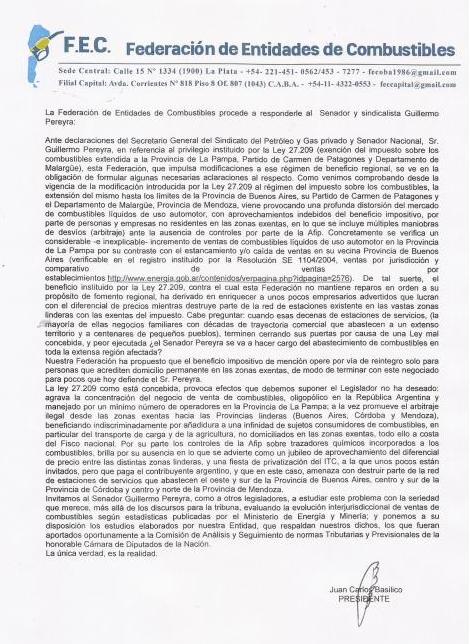 La Federación de Entidades de Combustibles encabezada por su Presidente Juan Carlos Basilico, redactó una carta dirigida al Senador Nacional Guillermo Pereyra con el objetivo de manifestar la posición de los estacioneros bonaerenses respecto de la denominada “Ley Pichetto”, ante los dichos del Secretario General del gremio petrolero, contra cualquier modificación referida a los impuestos sobre los combustibles.