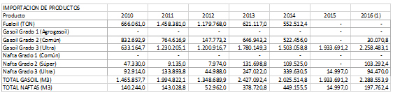 Respecto a lo sucedido con la importación de subproductos es posible observar que los niveles de importación son todavía inferiores a los verificados durante el 2013 (gasoil) y 2013-2014 (naftas).