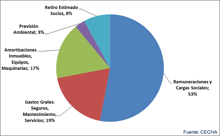 En ese sentido enumeró que las remuneraciones al personal y cargas sociales representan el 53 por ciento; los gastos por seguros, honorarios, mantenimiento general, servicios (agua, energía teléfono), impuestos municipales, publicidad, etc, el 19; las amortizaciones del inmueble y de los bienes muebles, 17; la previsión ambiental, 3 y el retiro estimado de socios el 8 por ciento.
